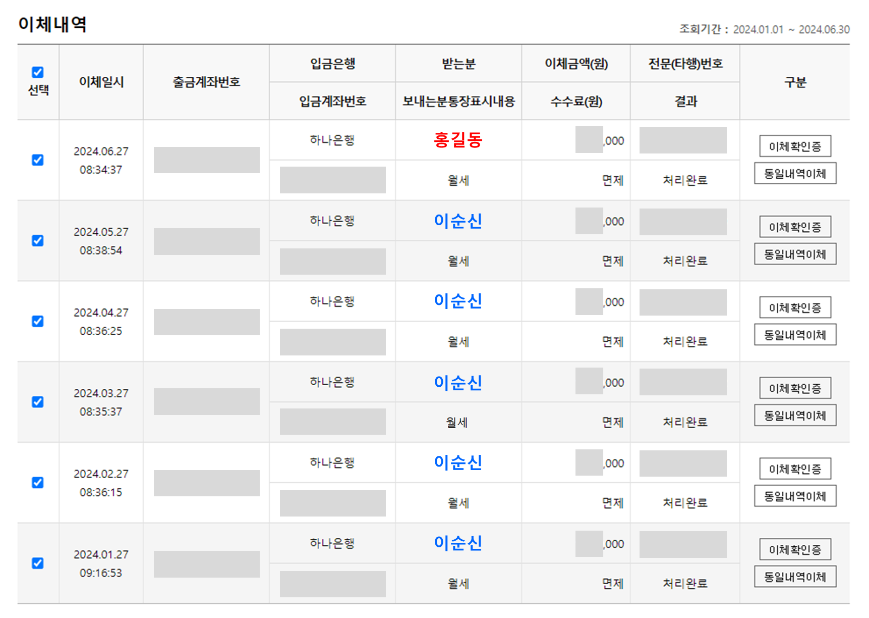 1월부터 5월까지는 집주인 분(가명 : 이순신)에게 이체가 되었는데, 지난달인 6월에는 처음 보는 분(가명 : 홍길동)에게 이체가 되어 있었습니다.