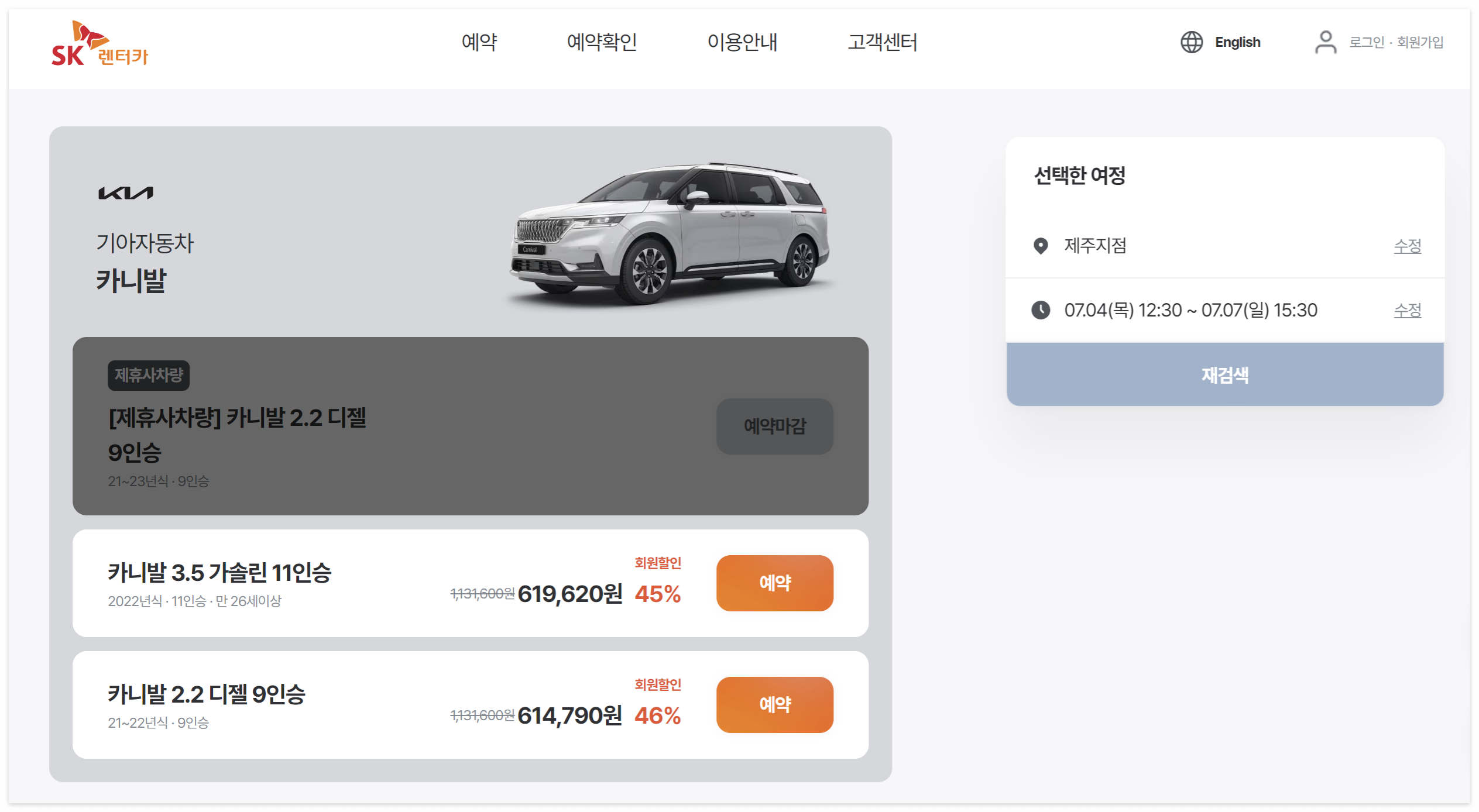- 위 예시에서는 동일기간, 동일차량임에도 불구하고 SK렌터카가 훨씬 비싸게 나옵니다.