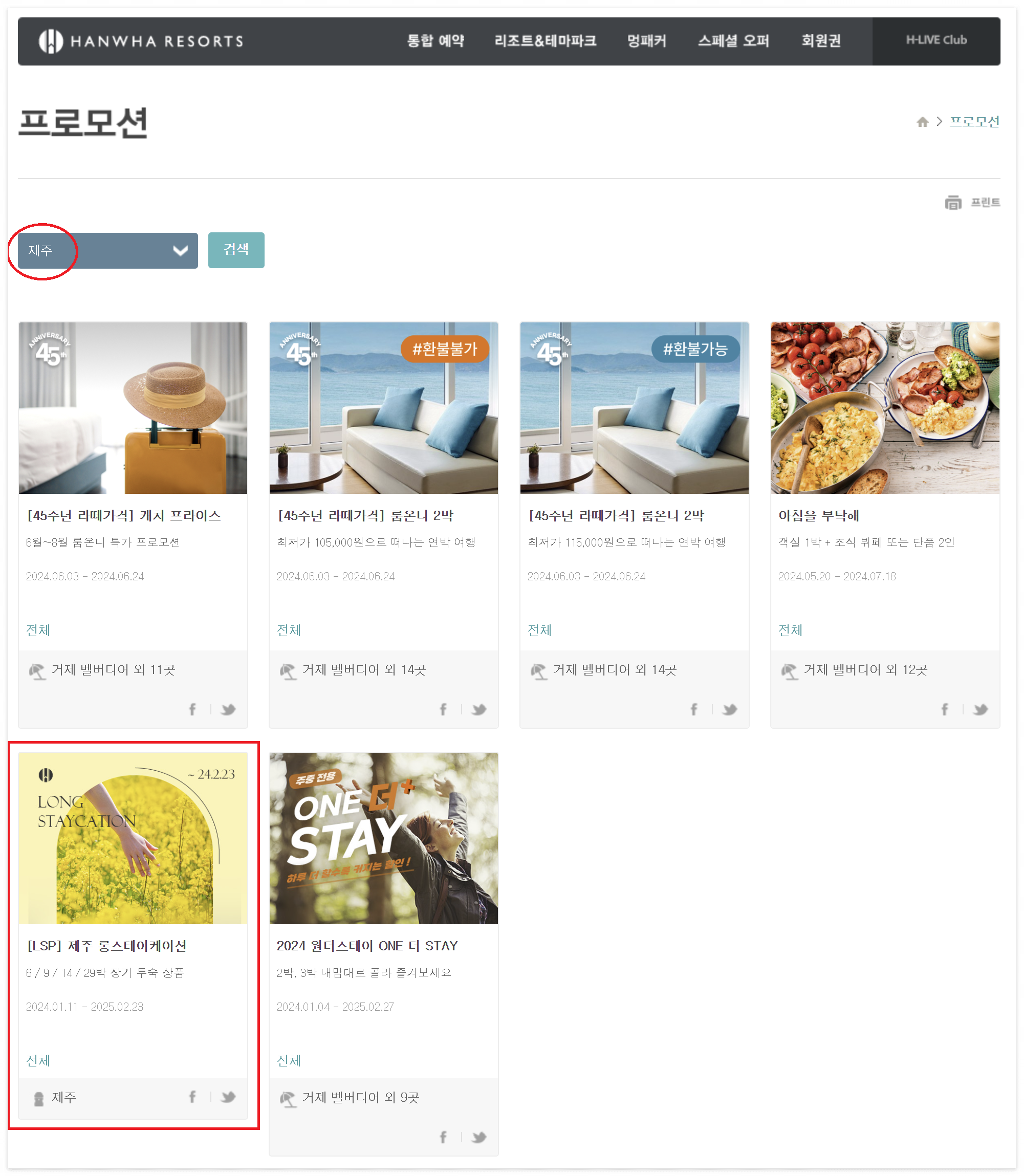 프로모션 선택란에서 '제주'를 검색합니다. (아래사진)